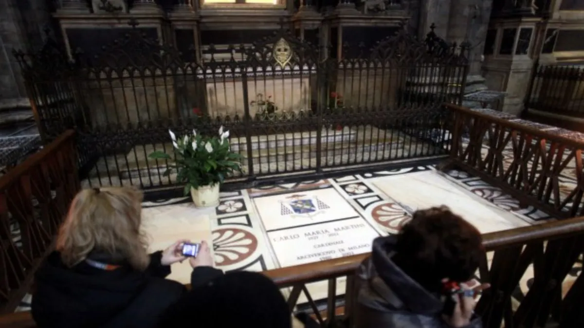 También visito la tumba del que fue jesuita y cardenal Martini, fallecido en 2012, diez años después de su jubilación del Arzobispado ambrosiano; en aquella tumba está depositado definitivamente el cadáver del turinés y alto clérigo, monseñor Carlo María, encontrándose al medio de la nave a la izquierda entrando en la Catedral, teniendo a su fondo o enfrente, encima de un altar, un austero Cristo Crucificado. En la nave opuesta, la de la derecha, están las tumbas de otros arzobispos de Milán, como Colombo o Tettamanzi, al que sucedió Angelo Scola, aún vivo y emérito, aunque ridiculizado por lo del Cónclave de 2005.