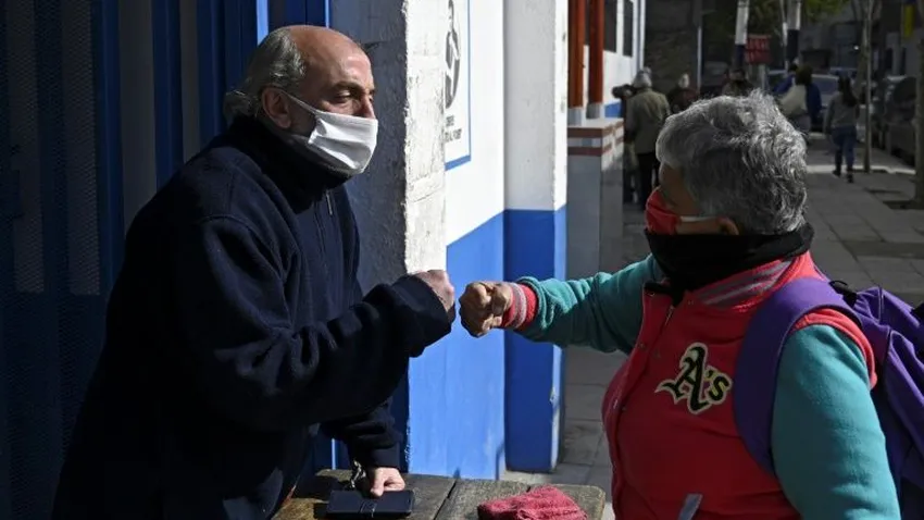 Como todos los mediodías desde que cerraron los comedores comunitarios, numerosos vecinos forman fila frente a la capilla, con barbijo y respetando la distancia, a la espera de las viandas.