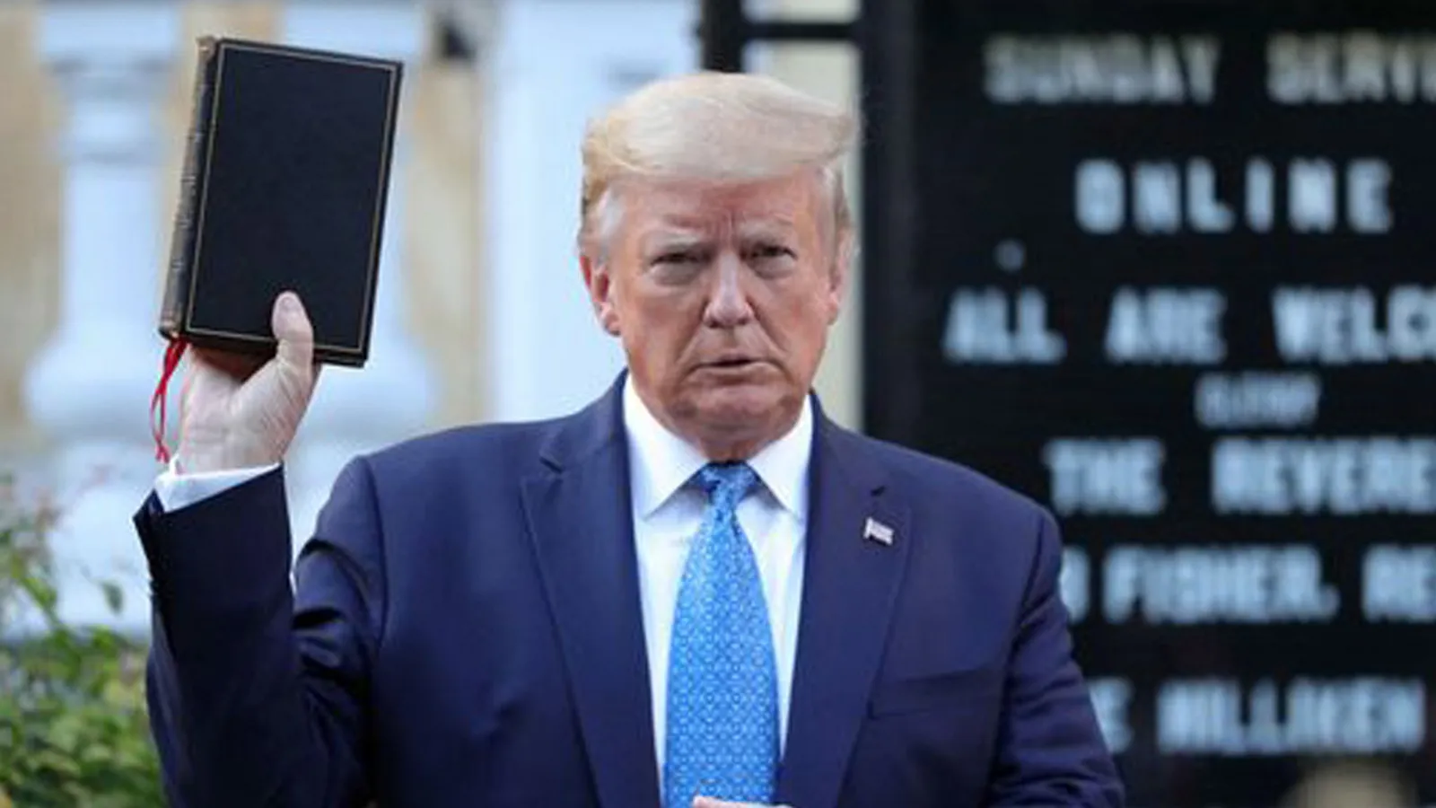 En el video, con un trasfondo de dos banderas estadounidenses, Trump aparece sosteniendo en su mano una copia de la Biblia en la versión tradicionalista del Rey Santiago (King James Bible).