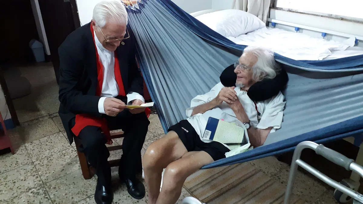 Nos despedimos de Ernesto. El padre Ángel sigue emocionado. Le aprieta fuerte la mano y todos los presentes nos disponemos a pedir su bendición. El padre Ángel le pide su bendición, para él, para Mensajeros de la Paz, para los sin techo que atiende en Madrid.