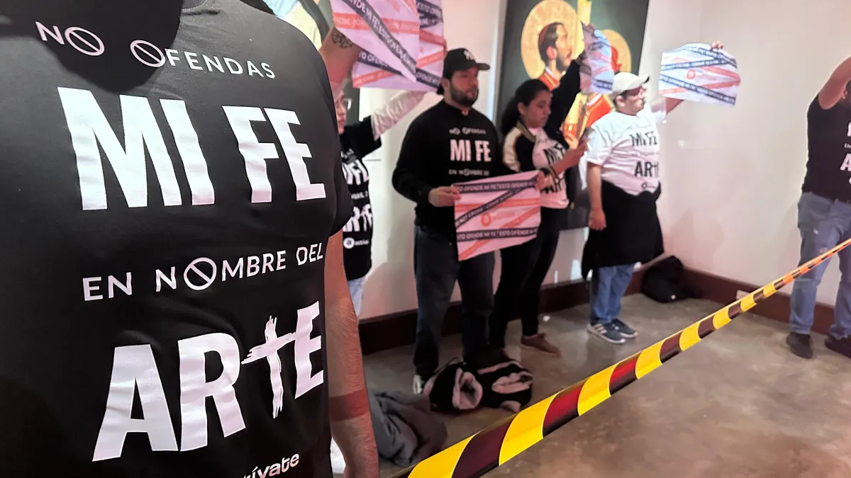 Un grupo de jóvenes activistas, bajo el lema “No ofendas mi fe en nombre del arte”, con cruces en la boca, ingresaron a la sala de exhibición y colocaron cintas de clausura alrededor de las obras.