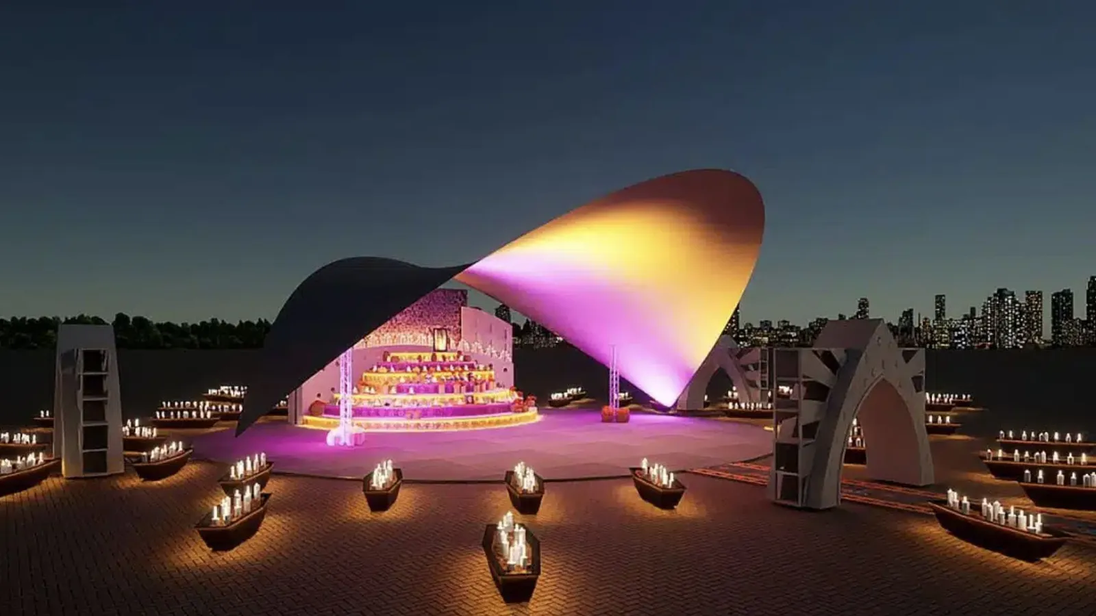 Para proteger el altar, se instalará una carpa de 18 m por 21 m con una forma orgánica y una altura máxima de 7.50 metros. La carpa contará con dos torres Truss de 3 metros en cada extremo, cada una con 10 luminarias de iluminación escenográfica orientadas hacia arriba.
