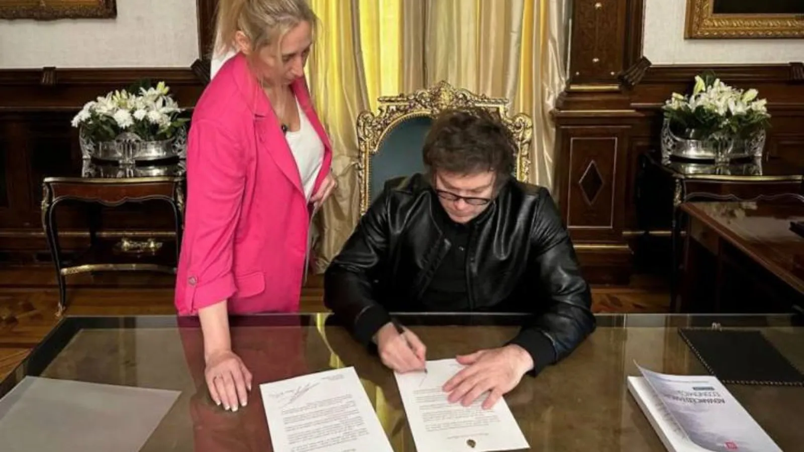Simultáneamente la Oficina del Jefe de Estado difundió el texto del mensaje de Milei a Francisco, junto con la imagen del momento en que la secretaria general de la Presidencia de la Nación, Karina Milei, le acerca la misiva para su firma.