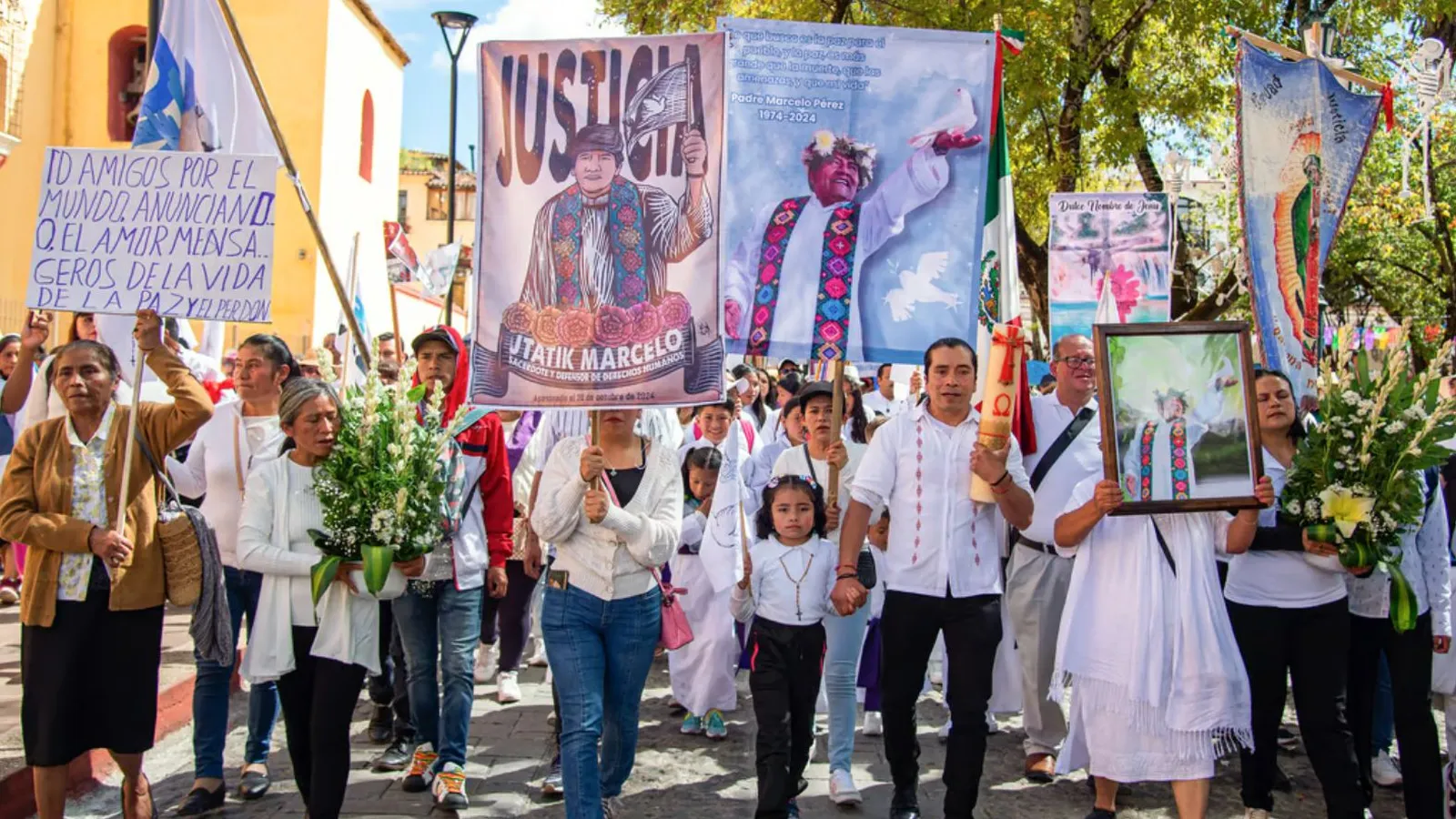 El contingente terminó en el centro de la ciudad frente al altar de flores de colores, semillas, veladoras, incienso, la imagen del padre Marcelo, la del obispo Samuel Ruiz García, y un templete donde oficiaron la misa y se leyeron las denuncias del pueblo creyente ante la ola de violencia del crimen organizado.