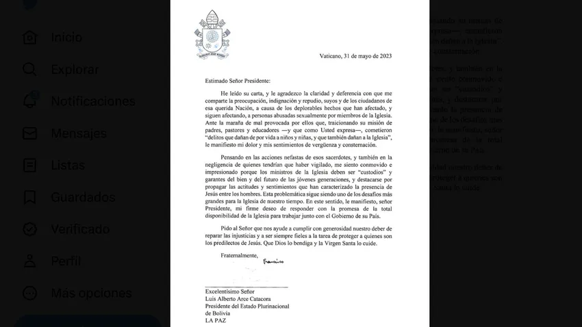 "Le manifiesto mi firme deseo de responder con la promesa de la total disponibilidad de la Iglesia para trabajar junto con el Gobierno de su país", expresó el Papa en una carta, firmada el 31 de mayo y enviada al presidente del país, Luis Alberto Arce.