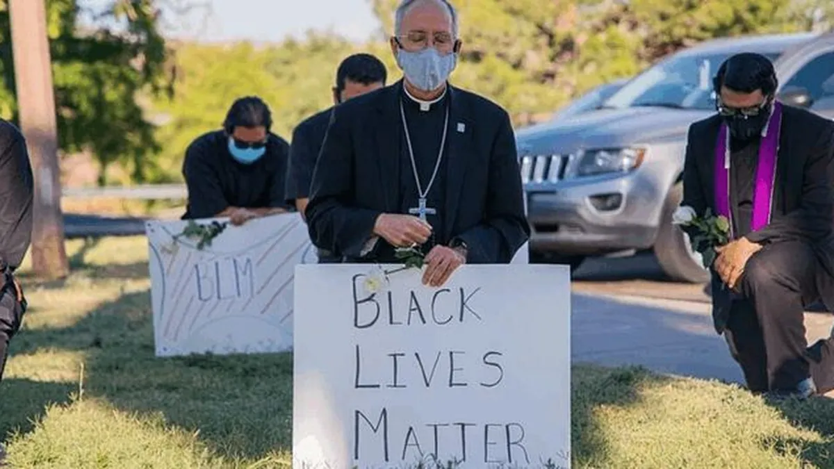 Seitz acudió el lunes a ese lugar para elevar una oración en memoria de George Floyd. Junto a el, una decena de sacerdotes se unieron a la plegaria, a la vez que sostenían en sus manos pancartas de "Black Lives Matter".