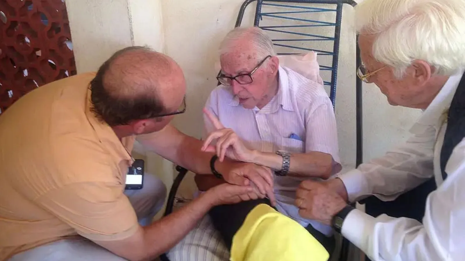 Le recuerdo en su silla baja, siempre ladeado hacia la derecha, con sus manos temblorosas y sus ojos siempre envolventes, y su paño amarillo, para secarse la saliva que, a veces, se le escapaba por la comisura de los labios, mientras intentaba balbucear unas palabras, que sólo entendíamos con la 'traducción' de Saraiva o de Valenzuela, dos de sus compañeros agustinos que lo acompañan desde hace años.