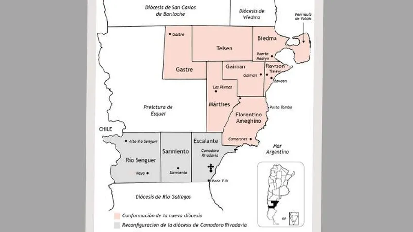 Por otra parte, la reconfigurada jurisdicción eclesiástica de Comodoro Rivadavia, se conformará con los departamentos de Escalante (14.015 km2), Sarmiento (14.563 km2) y Río Senguer (22.335 km2).