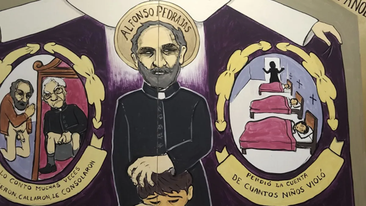 Lo segundo es un retablo con la secuencia de los abusos del sacerdote jesuita español Alfonso ‘Pica’ Pedrajas, que es presentado como el «santo pederasta» y en la imagen principal está el cura sosteniendo a un niño arrodillado que muestra sumisión.