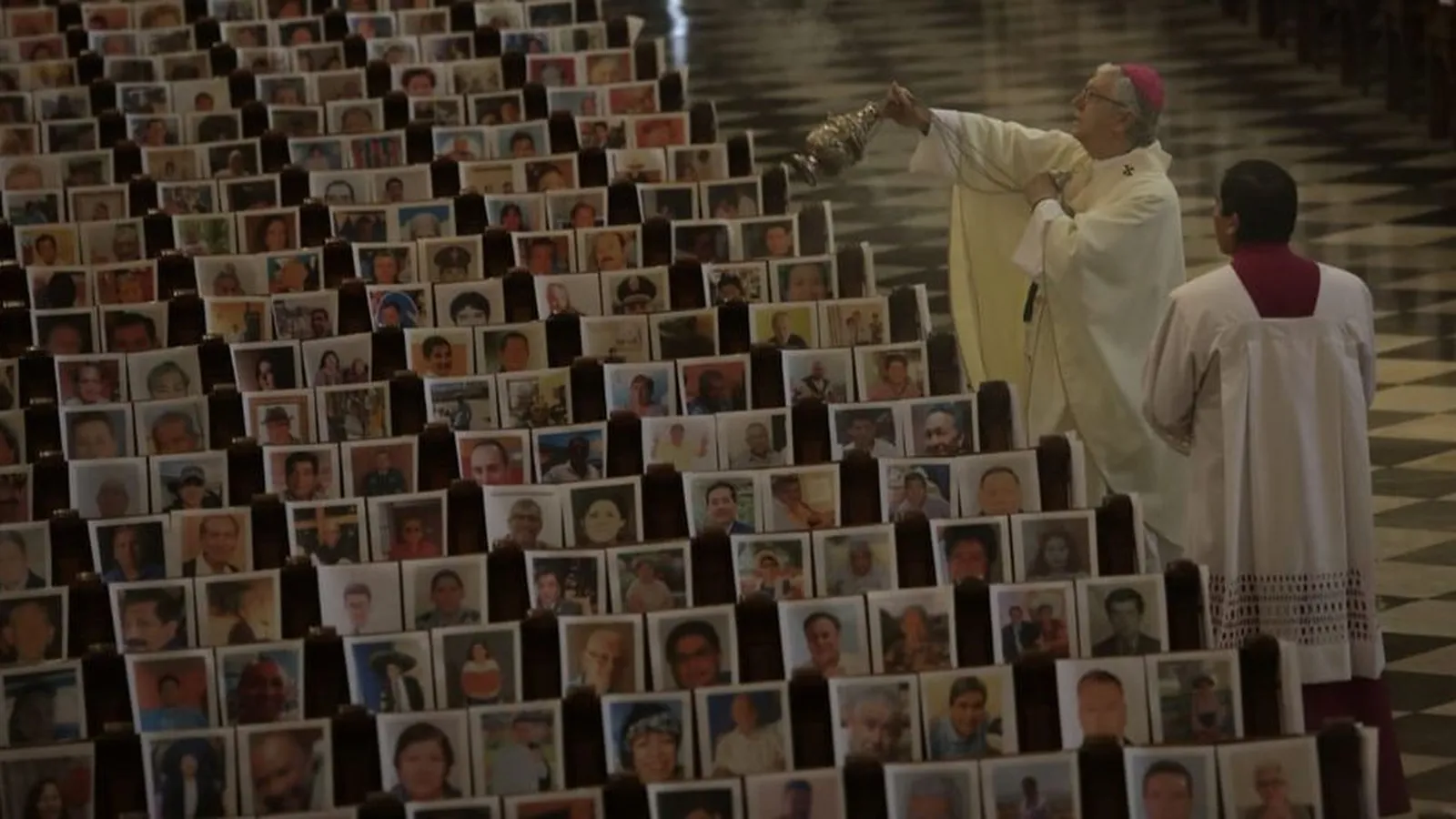 Con la catedral a puerta cerrada, las imágenes de las víctimas mortales de la pandemia fueron los únicos asistentes de esta homilía que fue transmitida por televisión nacional y por redes sociales.