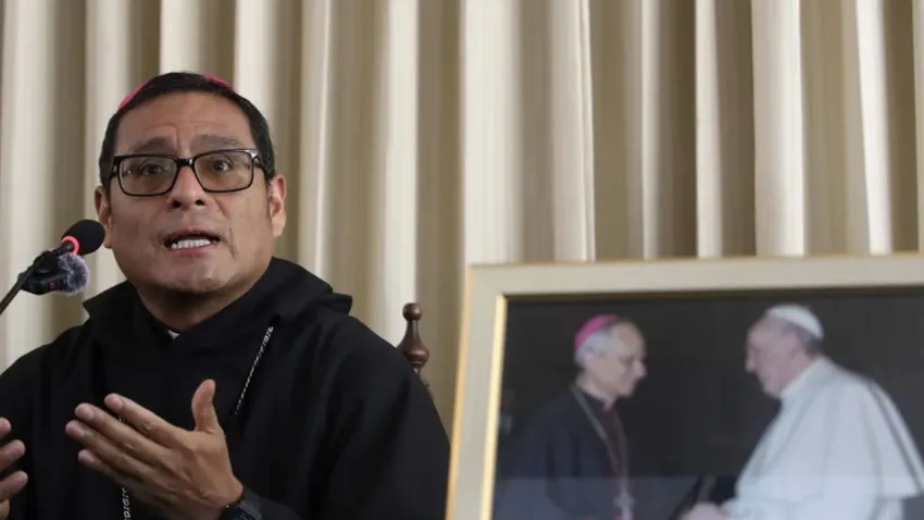El obispo de Chiclayo, monseñor Edinson Farfán Córdova, habla este viernes, durante una rueda de prensa en Chiclayo (Perú), en la que desmitió que el papa León XIV encubriera presuntos abusos sexuales. EFE/ Paolo Aguilar