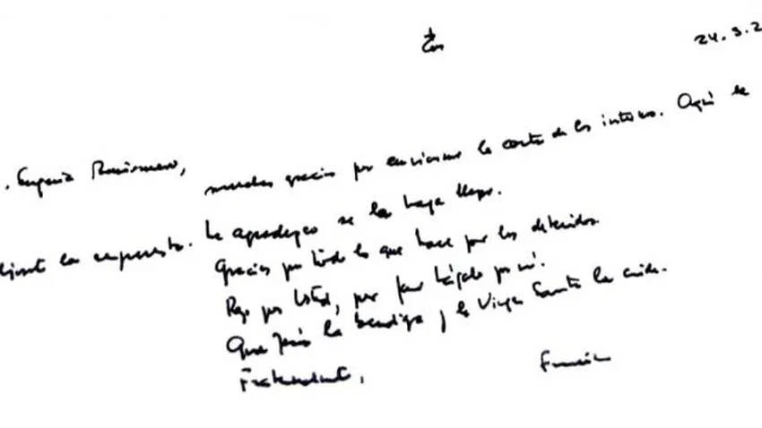 "Los tengo presente y rezo por ustedes. Les pido -por favor- que lo hagan por mí. Estoy cerca de ustedes. Se acerca la Pascua. Les deseo una Santa y feliz Pascua. Quedo a disposición de ustedes. Que Jesús los bendiga y la Virgen Santa los cuide. Fraternalmente, Francisco", escribió el pontífice.