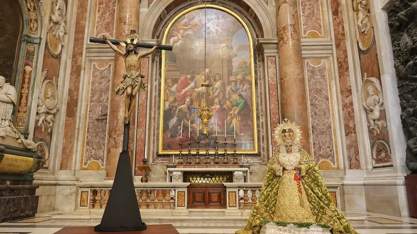 El Cristo de la Expiración de la Hermandad del Cachorro de Sevilla y la Virgen de la Esperanza de Málaga ya reciben culto en la Capilla de la Presentación de la Virgen de la Basílica de San Pedro en el Vaticano. Las imágenes llegaron a Roma durante la jornada de este martes y desde este miércoles y hasta el viernes se les rendirá culto en horario de 07,00 a 19,00 horas.