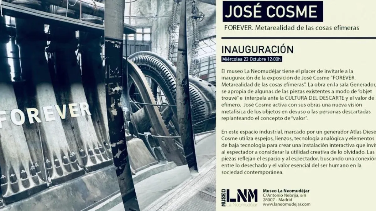 En su trayectoria internacional en EEUU y Asia y después de su última exposición en el MAC Museo de arte Contemporáneo de Bogota, el artista valenciano José Cosme reaparece en España con una individual en el museo La Neomudéjar de Madrid bajo el título : "FOREVER. Metarealidad de las cosas efímeras". La obra en la sala de La Máquina, se apropia de algunas de las piezas existentes a modo de “objet trouvé” e interpela con su obra al espectador ante la CULTURA DEL DESCARTE y el valor de lo efímero. José Cosme activa con sus obras una nueva visión metafísica de los objetos en desuso o de las personas descartadas, replanteando el concepto de “valor”. Las obras juegan a modo de instalación entre piezas de espejo que reflejan el generador, y otras obras visuales (videos, fotografías, objetos y lienzos).