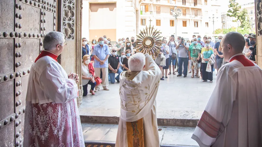 Con la catedral a la mitad de su aforo en cumplimiento de la normativa de las autoridades sanitarias, se celebró la Misa de la solemnidad de Corpus Christi presidida por el cardenal arzobispo de Valencia, Antonio Cañizares Llovera, a la que asistieron autoridades civiles, militares y culturales. Concelebraron con él los obispos eméritos de Zaragoza y Lérida, Ureña y Piris, y los auxiliares, Escudero y Salinas, además del Cabildo. Todos los diáconos que le asistieron eran permanentes.