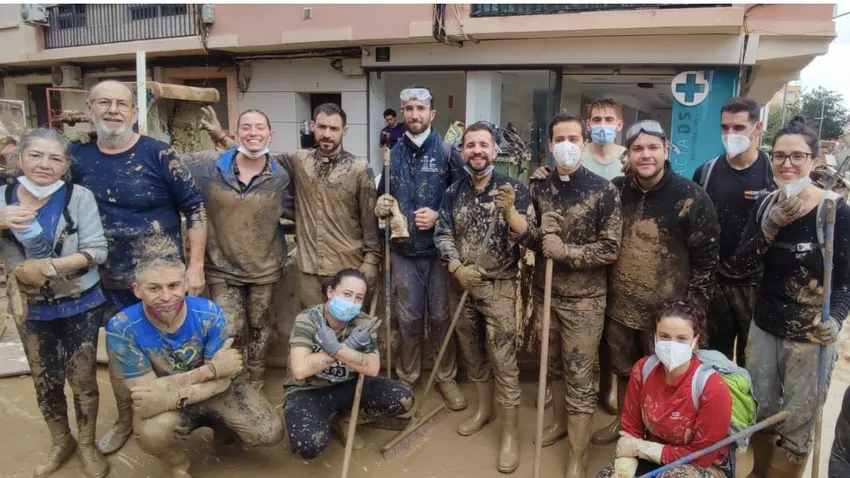 Jóvenes de una parroquia de Villaviciosa de Odón (Madrid) ayudan a limpiar el barro en Chiva y Catarroja