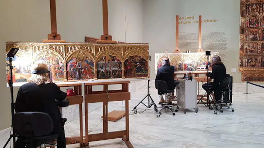 La labor está siendo realizada por el Institut Valencià de Conservació, Restauració i Investigació. El retablo es obra maestra de la pintura gótica valenciana, pintura alemana traída por los alemanes que en el siglo XV vinieron a Valencia a trabajar y la adaptaron a nuestro Mediterráneo. En este caso fue un encargo de los Ballesteros y Compañía del Centenar de la Ploma que unos dicen fue para la Capilla de los Ballesteros, pero otros defienden se hizo para la Iglesia de san Jorge.
