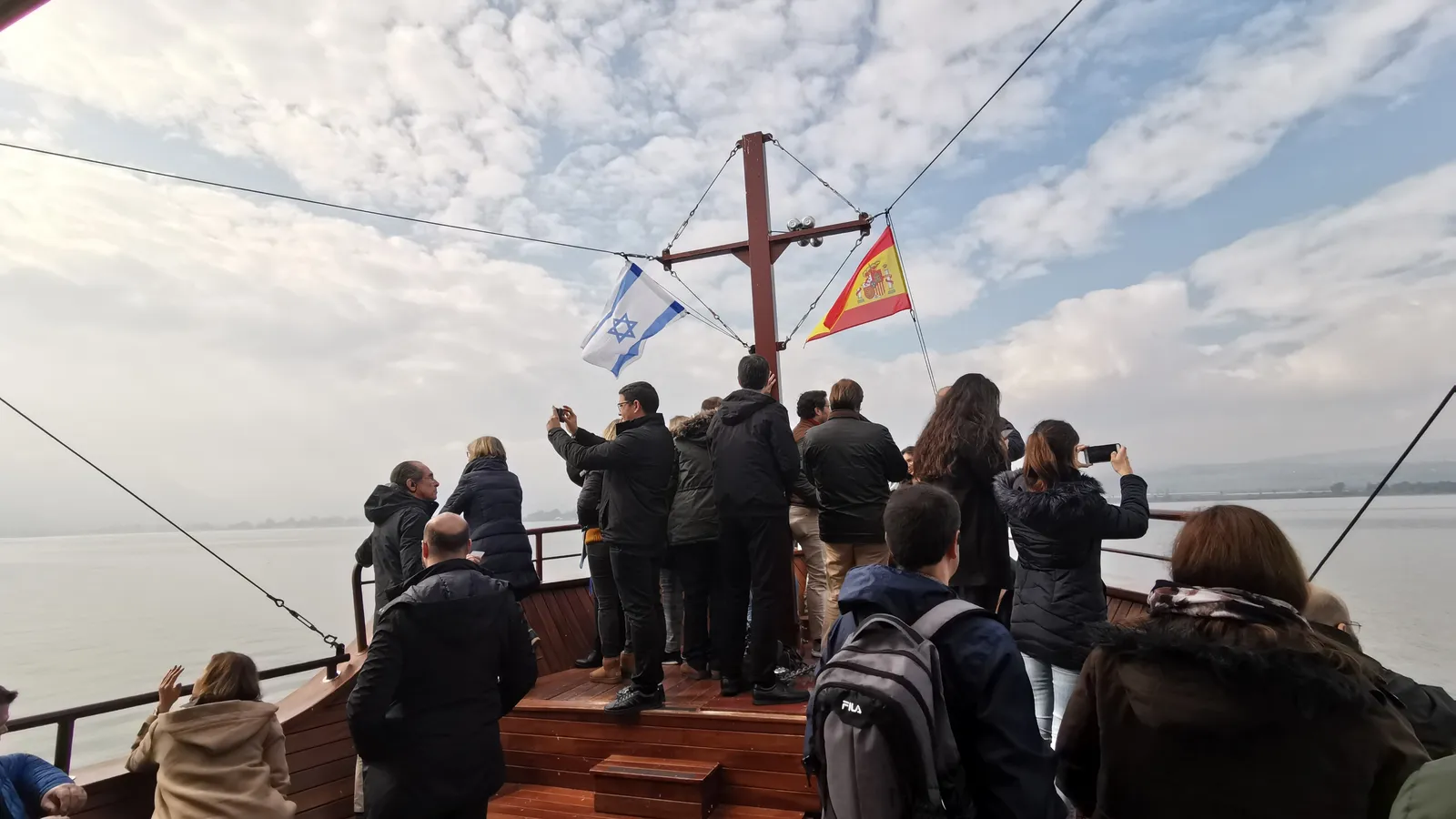 Un marinero de la tripulación ha izado la bandera de España, junto a la de Israel con la estrella de David, que simboliza que Dios protege a Israel por todas partes. Nos hemos adentrado en la mar, hoy con aguas tranquilas, quietas y serenas, invitatorias a la paz, la serenidad y la reflexión. El barco ha parado motores. Ha permanecido mudo e inmóvil. El silencio se ha hecho y pareciera que allí estuviera deslizándose por las aguas Jesús. Oasis de paz alejado del fragor de vehículos y ruidos de estos pueblos y ciudades. El Señor Jesús en su estado más puro.