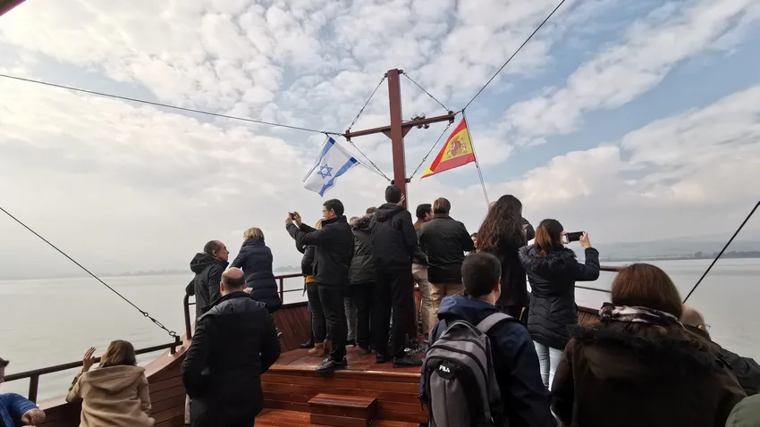 Los Peregrinos han subido en una barcaza para recordar la aparición de Jesús a algunos de sus apóstoles. El franciscano fray Luís Quintana, cabeza de expedición, ha leído el Evangelio que relata el hecho: “ Estaban juntos Simón Pedro, Tomás, llamado el Mellizo, Natanael, el de Caná de Galilea, los de Zebedeo y otros dos de sus discípulos. Simón Pedro les dice: «Voy a pescar.» Le contestan ellos: «También nosotros vamos contigo.» Fueron y subieron a la barca, pero aquella noche no pescaron nada. Cuando ya amaneció, estaba Jesús en la orilla; pero los discípulos no sabían que era Jesús. Díceles Jesús: «Muchachos, ¿no tenéis pescado?» Le contestaron: «No.». El les dijo: «Echad la red a la derecha de la barca y encontraréis.» La echaron, pues, y ya no podían arrastrarla por la abundancia de peces. El discípulo a quien Jesús amaba dice entonces a Pedro: «Es el Señor», se puso el vestido -pues estaba desnudo- y se lanzó al mar”.