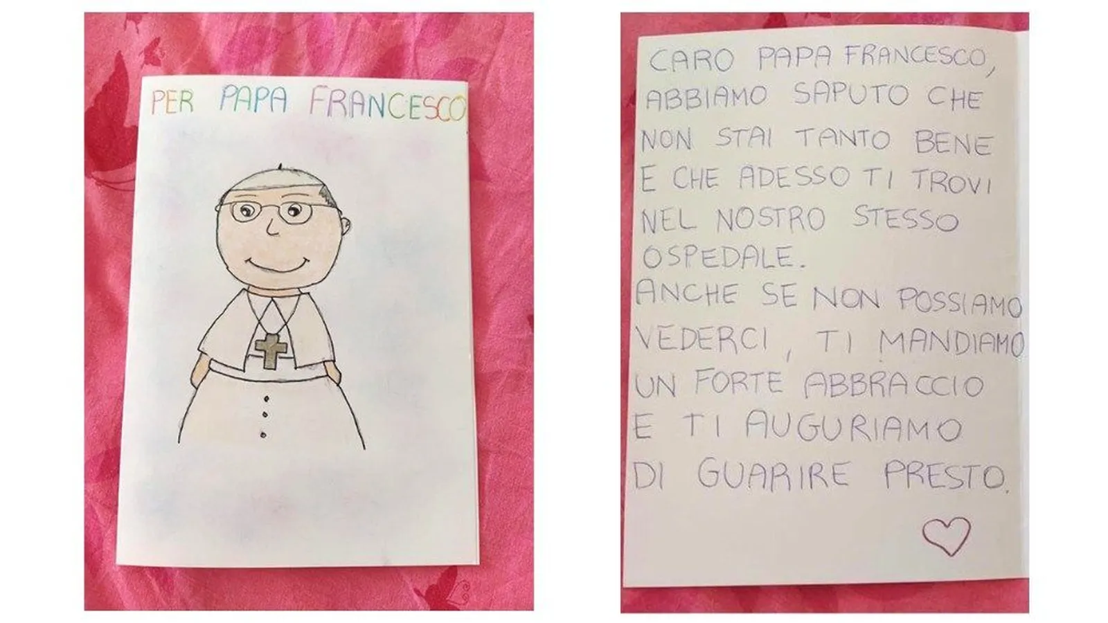 Un breve mensaje escrito desde el corazón que el Santo Padre pudo leer. "Aunque no podamos vernos -sigue diciendo la carta- te enviamos un fuerte abrazo y te deseamos una pronta recuperación".