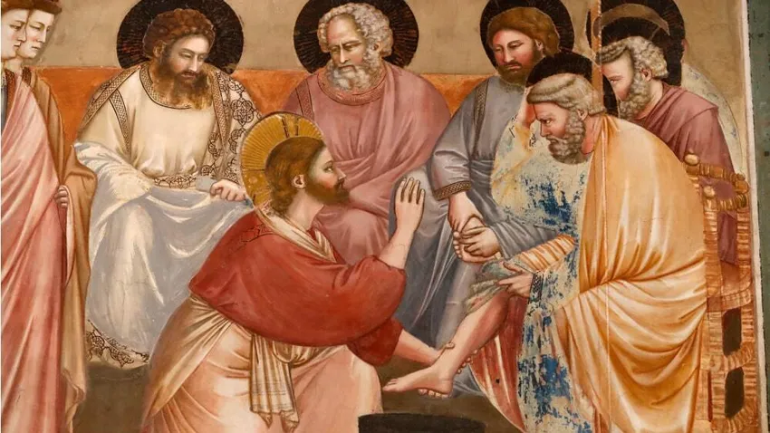 En el transcurso de la cena se levantó de la mesa, se quitó el manto —el manto era una costumbre judía que significaba autoridad—, y tomando una toalla, propio de los servidores, se la ciñó. Luego echó agua en una jofaina y se puso a lavarles los pies a sus discípulos, y a secárselos con la toalla que se había ceñido.
