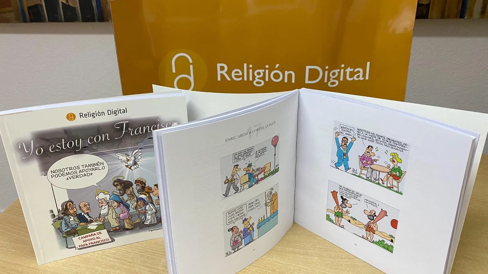 “Somos católicos, apostólicos y romanos, San Cosme”, reiteran, ante una imagen, un matrimonio ‘tradicional’. El santo, desde su peana, les pregunta: ‘Pero del Papa Francisco, ¿no?’. Otro señor, haciendo el crucigrama del periódico mientras toma el aperitivo, y pregunta la respuesta al camarero: “Obispo de Roma al que abroncamos los católicos ultras”. “Si acierta, le dejaré una buena propina”. Estas son dos de las viñetas que el genial Enric Arenós Cortés, ‘Quique’, preparó para el especial RDconelPapa, que la semana pasada entregamos a Francisco durante nuestro encuentro en Roma.