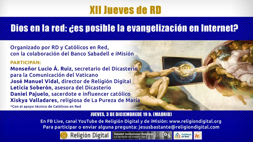 El evento, organizado por RD con la colaboración de Católicos en Red, iMision y el patrocinio del Banco Sabadell, 'Dios en la red: ¿es posible la evangelización en Internet?', se podrá seguir este jueves, a las 19h (Madrid), en el youtube de RD y de iMision, en nuestro Facebook y en el de la plataforma, así como en la portada de www.religiondigital.org