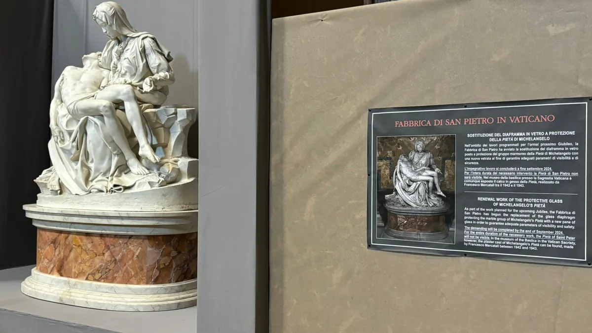 Desde esta semana y por cerca de dos meses, los más de 25.000 visitantes diarios de la Basílica de San Pedro podrán admirar a la más famosa de las réplicas de La Piedad de Miguel Ángel mientras se avanza con la construcción de un nuevo blindaje compuesto por nueve capas de vidrio para la monumental escultura símbolo del Vaticano.
