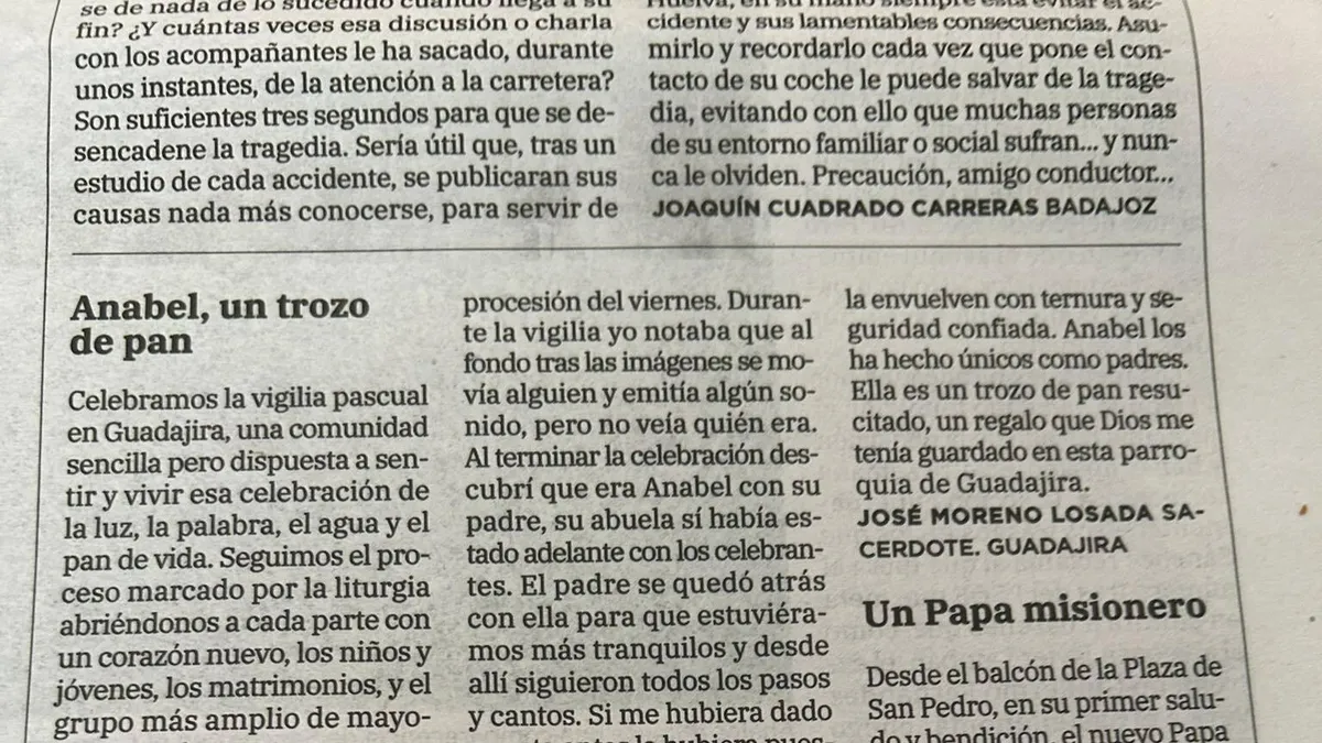 Me rindo a la dulzura de sus padres y a cómo la envuelven en pañales de ternura y seguridad confiada. Anabel los ha hecho únicos como padres. Ojalá yo sepa dejarme hacer único por ella, por su riqueza de gracia y de luz. Ella es un trozo de pan resucitado, de Jesús glorioso, aquí en la tierra y en el pueblo, un regalo que Dios me tenía guardado en esta parroquia de Guadajira. Ojalá yo sepa mostrarla como una señal del resucitado.