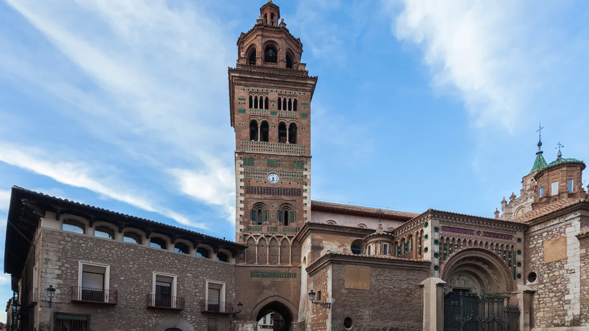 Sin poder prescindir cívicamente del “Torico”, de su plaza y de su monumento, dirigimos cuanto antes los pasos hacia la catedral, heredera que fuera de la primitiva iglesia a la que se refiere el Fuero de Teruel de 1176, que posteriormente lograría el título de Colegiata y más tarde, ya durante el reinado de Felipe II, el de Catedral, al crearse la diócesis. Construido en ladrillo y mampostería, el templo consta de tres naves, con techumbre plana y más baja en las laterales. Está dedicado a santa María de Mediavilla y es el ejemplar más preclaro, noble y emblemático del estilo gótico-mudéjar de Aragón, con categoría de “Patrimonio de la Humanidad” desde el año 1986.