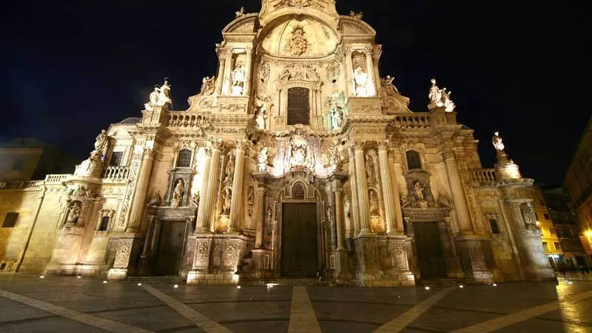 La gran fachada-retablo en piedra de la catedral, como no podía dejar de ser de otra manera y junto a su palacio episcopal, se avecinda en la plaza del Cardenal Belluga. La portada es ciertamente espectacular y de las que su recuerdo perdura por muchos templos, catedralicios o no, que hayan sido visitados en el “iter” turístico personal o colectivo. En el espacio de 54 metros de altura se instalan 20 esculturas, que son y encarnan otros tantos capítulos de la historia eclesiástica universal y de la murciana.”La Ciudad de Dios” y la “Jerusalén Celestial”´ se hacen presentes con rigor, devoción y prisas por adentrarse en sus interiores, con respeto a las correspondientes limitaciones coronavíricas temporales, con la nota de que “dada la situación actual, la catedral de Murcia permanecerá cerrada hasta nuevo aviso”. La devoción a la Virgen María, en el misterio su Asunción, está reflejada y esculpida a la perfección en la fachada. Los nombres del Pozo, de las Cadenas y de los Apóstoles bautizan el resto de las puertas de la catedral.