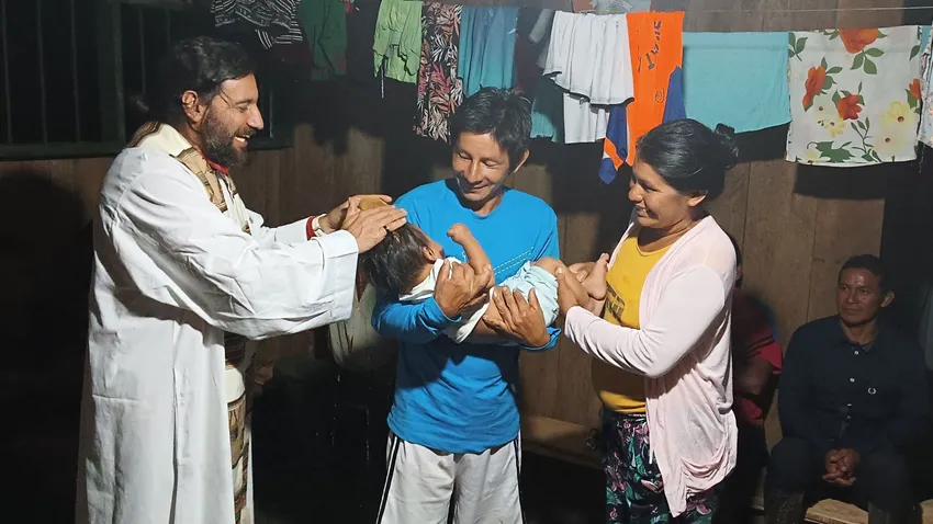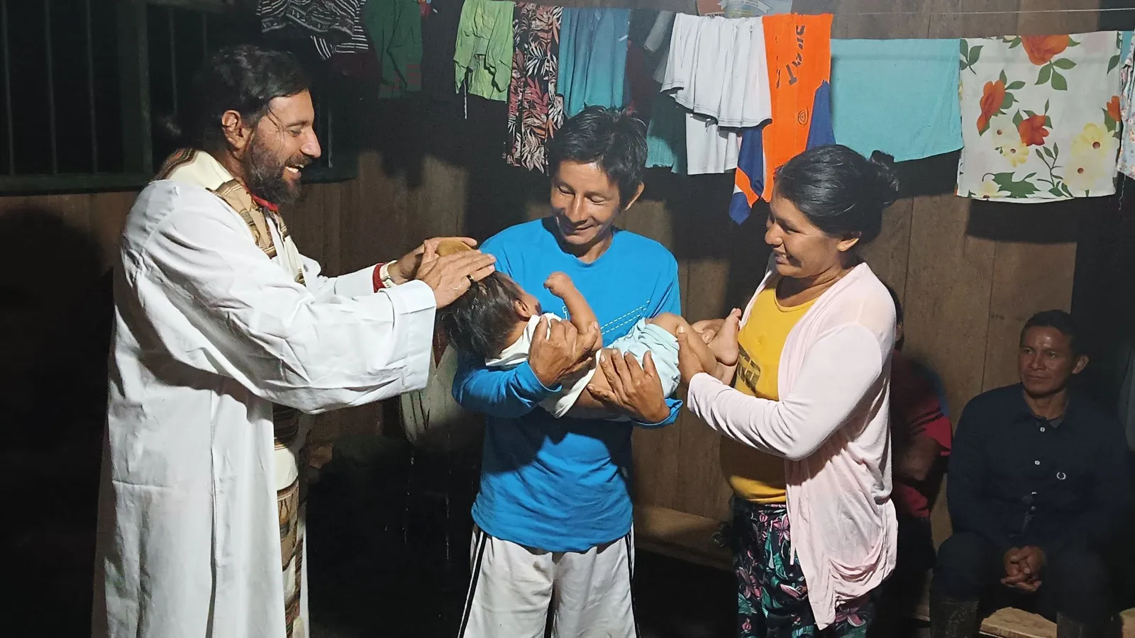 Se ha hecho de noche y han prendido un motor, DNIs vienen y van para completar los datos, sobre el piso hay preparado un balde de agua, una vela y los óleos. La ceremonia me permite fijarme en Fernando en acción. Es un misionero ya experto, muy carismático, identificado con los indígenas, murui de adopción, militante del diálogo intercultural. En su manera no hay solemnidad, sí cercanía, constantes bromas y el interés por dirigirse a los participantes en sus códigos; intuyo que, hasta alcanzar esta noche, fueron necesarias muchas visitas, horas de escucha, paciencia y amor por estos pueblos.