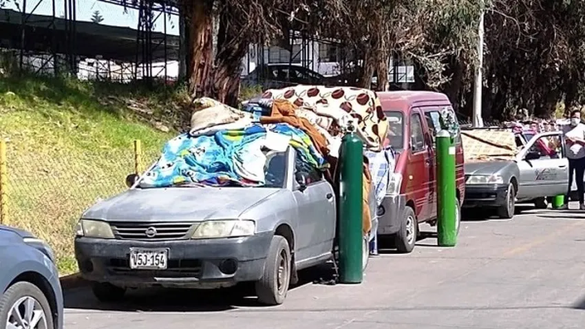Junto a la puerta del hospital de Arequipa, autos convertidos en improvisadas camas de hospitalización, con un balón de oxígeno de pie a su costado