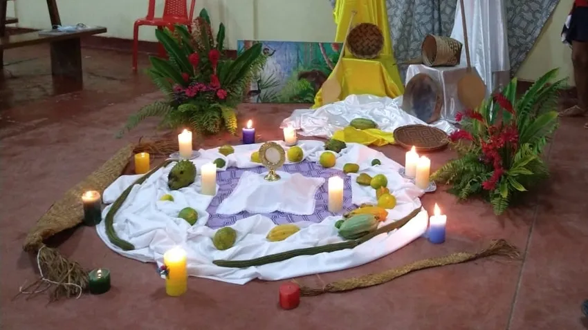 Todo comienza por la decoración: el Santísimo está colocado en el piso, donde almuerzan los indígenas; rodeado de frutos locales (carambola, anona, guanábana, maracuyá, humarí, guaba…) y flanqueado por plantas y flores de la selva. Diversas artesanías y pinturas lo engalanan, y varias velas iluminan el conjunto, al igual que harán en la mayoría de las casas del Estrecho cuando esta noche a las 11 se corte la electricidad por hoy. En un mundo de madera, tela y fibras de palmera, la pequeña custodia es lo único metálico.