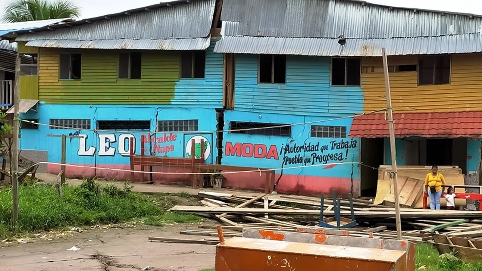 Un paseo con la hermana Eliana para observar y apreciar. La pista cuarteada y completamente rota en muchos lugares. El salón parroquial-iglesia (en plena reforma y mejora), moteado de rajas y fisuras. Viviendas literalmente partidas en dos, como la de la imagen; franjas enteras de calle totalmente hundidas; inmensos socavones… Mucha gente ha tenido que abandonar sus casas y buscar asilo con familiares ubicados en la loma, más arriba y a salvo de las agresiones del Napo. Una señora miraba cómo varios trabajadores municipales desarmaban lo que quedaba de su vivienda: “Nos han dado terrenos y nos apoyan para rescatar las calaminas buenas, pero ¿cómo voy a levantar mi casita nueva? Mis hermanos están fuera, somos puras mujeres”.