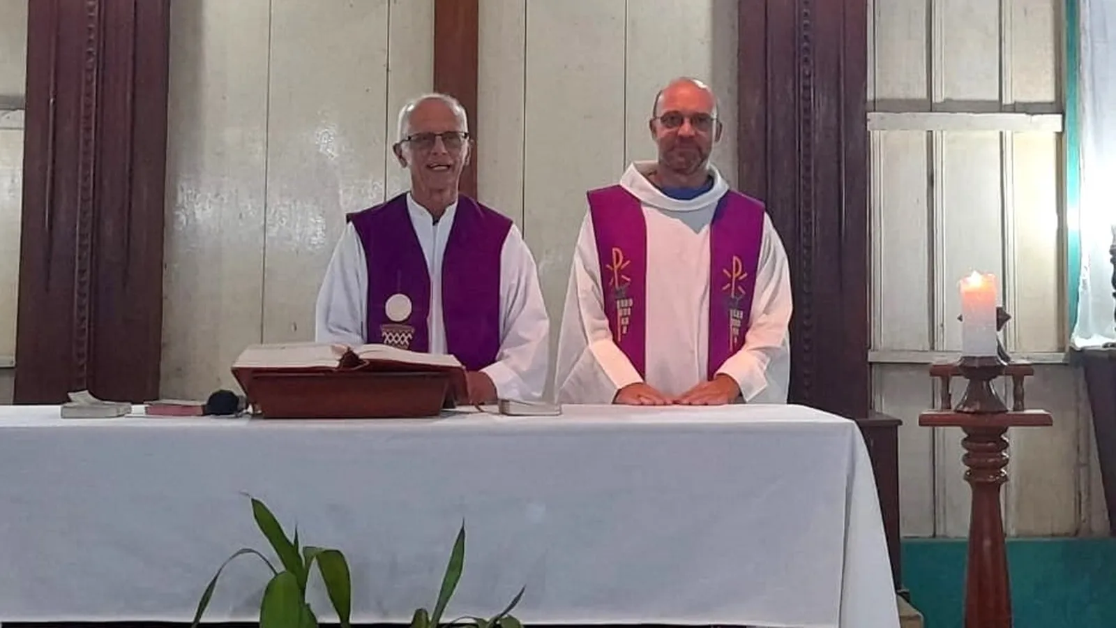 El mes que viene, el p. Yvan Boucher cumplirá 79 años. Vino de Canadá en 1981 y acá sigue; toda una vida en la selva, junto a este pueblo humilde pero sonriente. El otro día tuve la oportunidad de concelebrar con él en su misión de Tamshiyacu. Es uno de los grandes misioneros de nuestro Vicariato y no quise dejar pasar la oportunidad de que nos sacaran esta foto juntos.