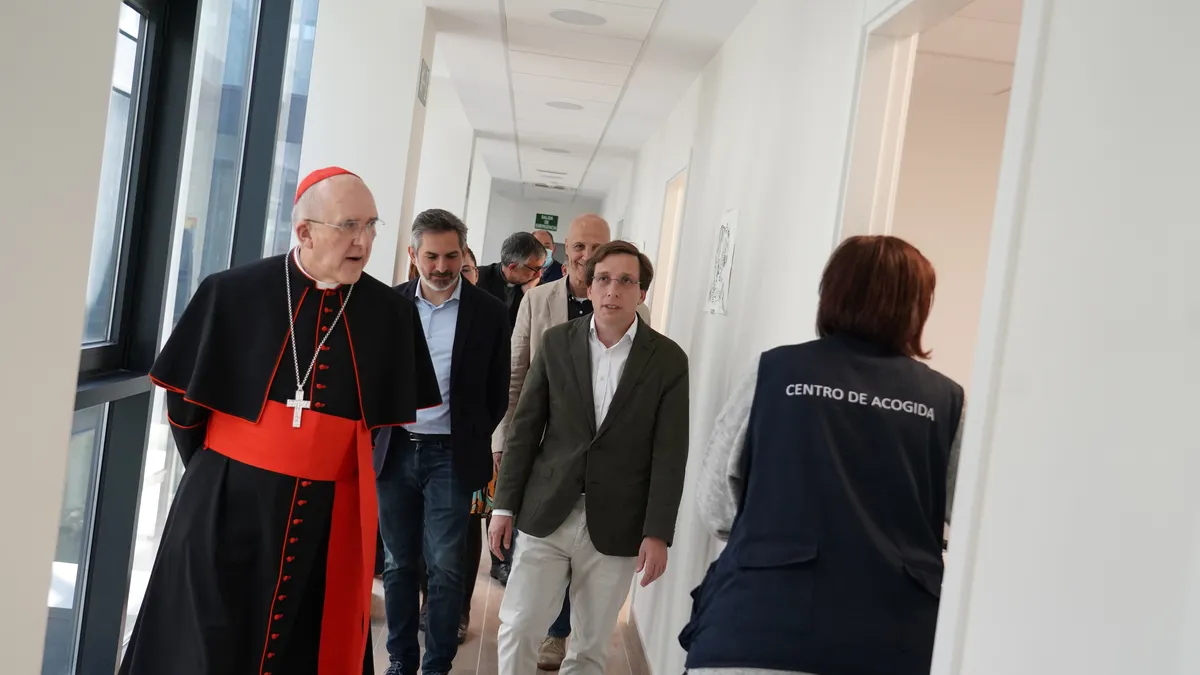 El alcalde de Madrid, José Luis Martínez-Almeida, junto al cardenal de la Archidiócesis de Madrid, Carlos Osoro, visitó este jueves el centro municipal Beatriz Galindo para mujeres sin hogar víctimas de violencia de género, el primero de este tipo en España.