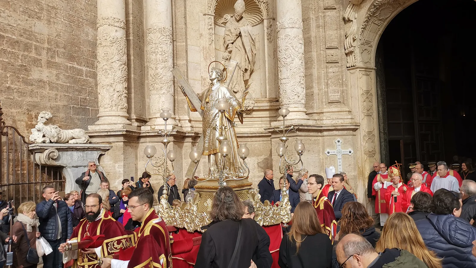 Concluida la Misa a la que han asistido las primeras autoridades civiles (PP, CS y Vox) – entre los que estaba el Senador del Reino y Presidente de la Orden del Santo Sepulcro en Valencia, Fernando de Rosa- y militares, se ha organizado la tradicional procesión que hace estación en los lugares donde estuvo detenido, martirizado y murió el diácono Vicente, todos adornados con palmas y murta alrededor de la Catedral, por estar asentada ésta sobre la ciudad romana, siendo acompañada la imagen del santo, de madera plateada del siglo XVIII, obra del escultor José Esteve, por su Cofradía y por los Cavallers Jurats de sant Vicent Ferrer, santo éste que tomó el nombre del primero, al nacer en el siglo XV en el mismo día que murió el diácono.