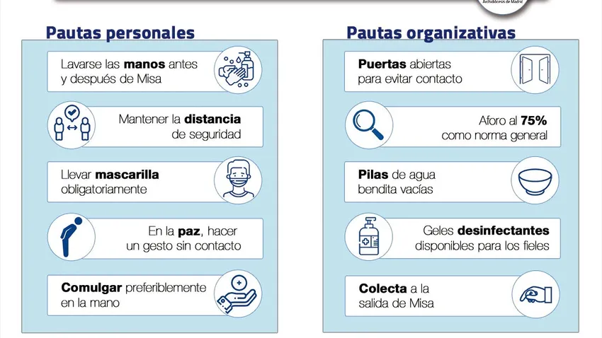 En este contexto, el Arzobispado recuerda que en todos los lugares de culto es obligatorio mantener la distancia de seguridad y el uso de mascarillas, que las pilas de agua bendita continúan vacías y que se debe ofrecer gel desinfectante. Además, el facultativo gesto de paz ha sido sustituido por uno sin contacto; la comunión se recomienda en la mano; se evitan los coros, y no se distribuyen hojas parroquiales ni ningún otro objeto.