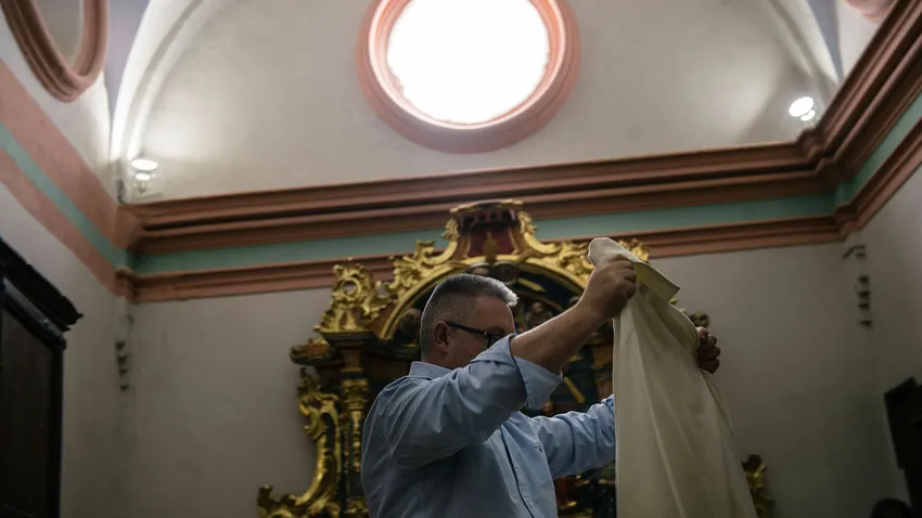 Hace frío y nadie se quita el abrigo. Las lecturas se hacen con las manos en los bolsillos. Las bajas temperaturas son un factor más a tener en cuenta cuando eres un cura rural. Nacho tiene a su cargo 12 pueblos: en tres no vive nadie y en el resto la media es de 30 personas. Cuando hace mal tiempo, la feligresa de alguno de estas poblaciones le manda un Whatsapp para que no vaya a dar misa. “La gente mayor no sale de casa si hace mucho frío y si voy, se sienten en la obligación de no dejarme solo en la iglesia”, cuenta este párroco.