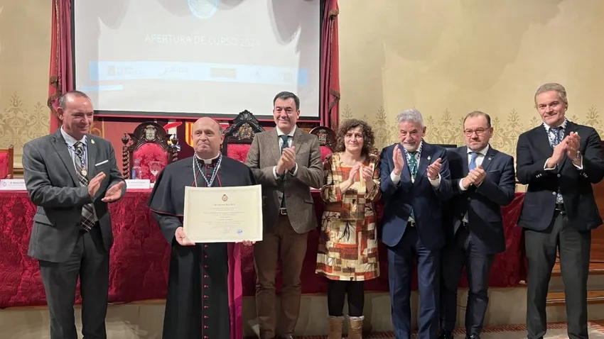 (Archisantiago).- A Academia Xacobea abriu esta tarde, de xeito oficial, as actividades do curso 2024 cunha sesión solemne que serviu tamén para dar entrada na institución como novo Académico de Honra ao arcebispo de Santiago de Compostela, Francisco José Prieto Fernández. No acto, celebrado no Paraninfo da Universidade de Santiago, tomaron a palabra o conselleiro de Cultura, Educación, Formación Profesional e Universidades, Román Rodríguez; a alcaldesa de Santiago, Goretti Sanmartín; o reitor da USC, Antonio López; o presidente da Academia Xacobea, Xesús Palmou; o secretario xeral, Ulises Bértolo, e os académicos Isidro García Tato e Milagros Otero Parga, encargados, respectivamente, de facer a laudatio do novo membro da Academia e de ler a lección inaugural do curso 2024.