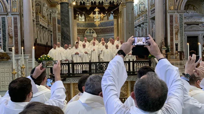 A primera hora del día, en la Catedral de Roma, basílica de san Juan de Letrán, Mons. Juan Antonio Aznárez Cobo se reunían todos los Obispos del cuarto grupo para celebrar la Eucaristía en este día en que se celebra la conversión de san Pablo. Se nos recordaba cómo san Pablo quedando ciego se dejó guiar y recuperando la vista supo anunciar a todos el Evangelio. Debemos sentir ese amor de Cristo en nuestras vidas, sentirlo, transmitirlo.