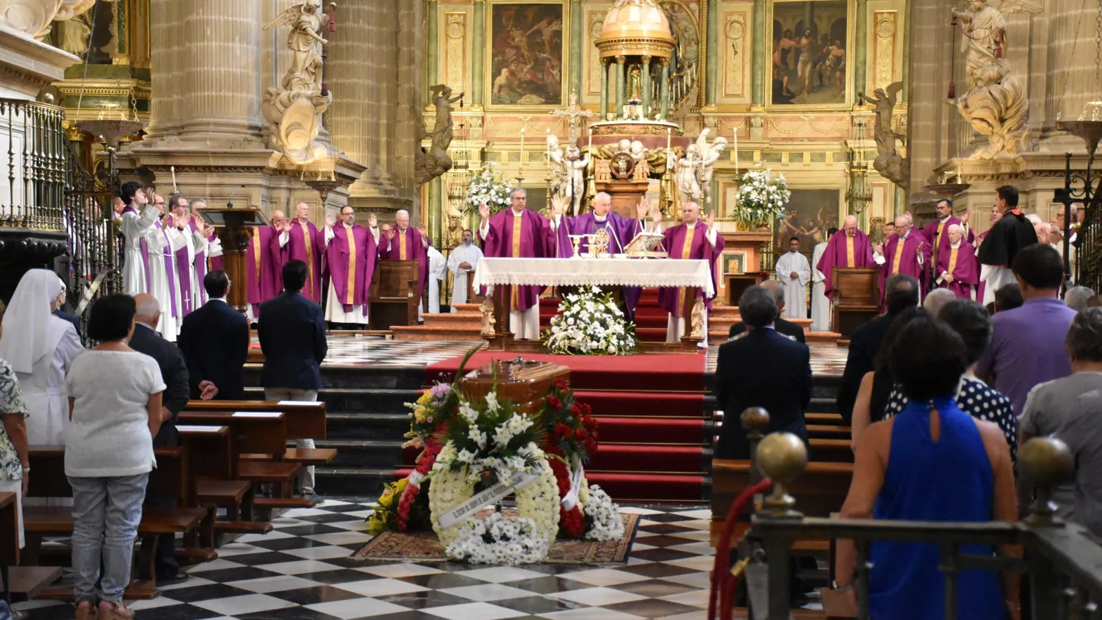 El féretro, a los pies del presbiterio, estaba rodeado de numerosas coronas en recuerdo y agradecimiento a su vida de servicio pastoral.