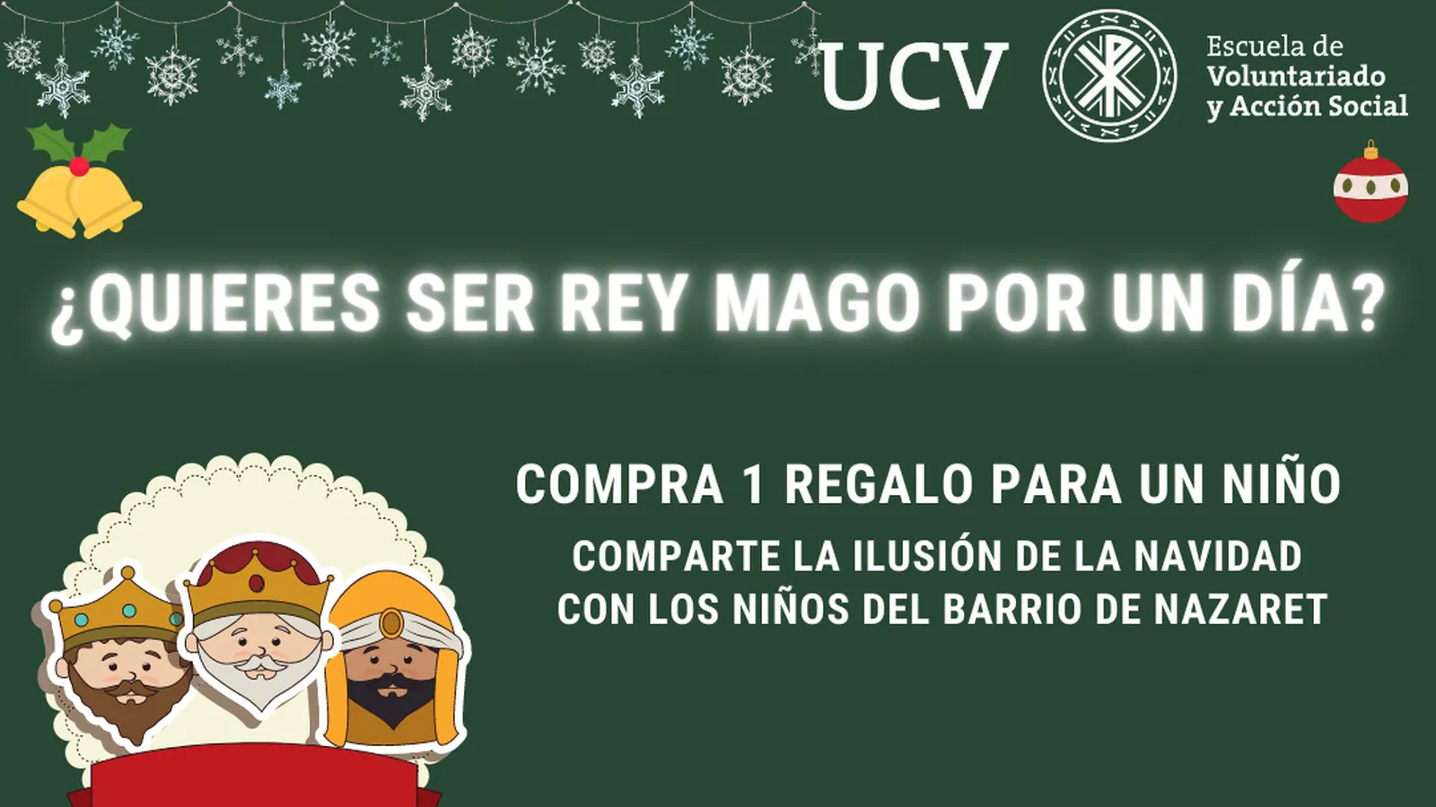 La Escuela de Voluntariado de la Universidad Católica de Valencia (UCV) ha lanzado una nueva campaña de cara a próxima celebración de la Navidad, que consta de tres acciones solidarias destinadas a niños sin recursos, ancianos internos en residencias y personas en situación de paro o de pobreza.