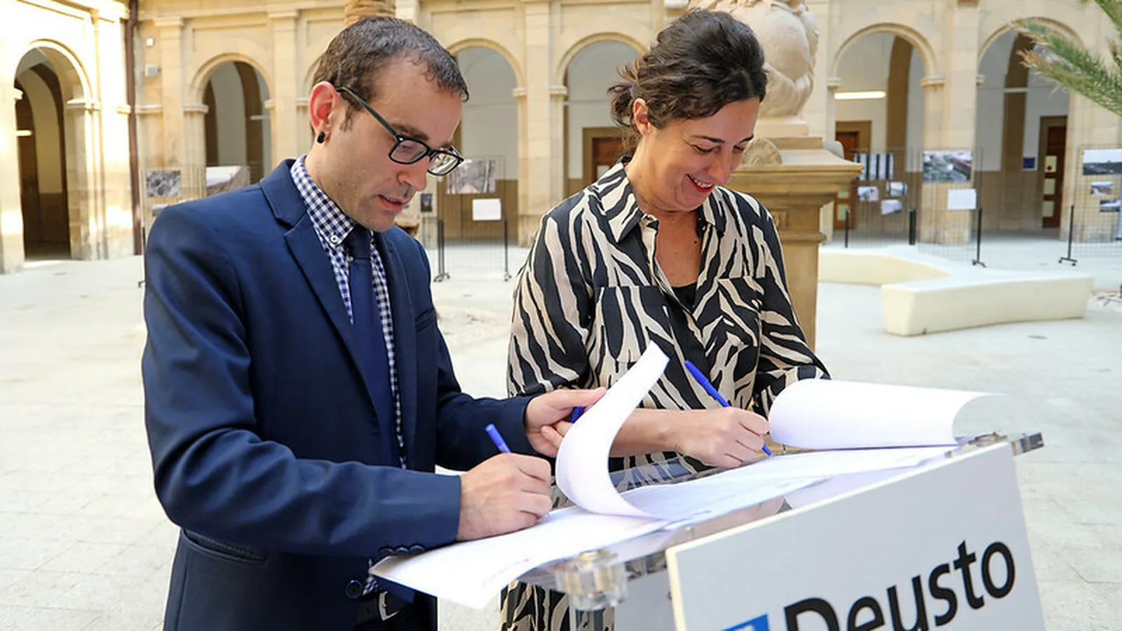 La diputada foral de Euskera y Cultura, Lorea Bilbao, y el vicerrector de Relaciones Internacionales de la Universidad de Deusto, Alex Rayón, han firmado esta mañana un protocolo de colaboración con el objetivo de fortalecer la difusión del patrimonio cultural de Bizkaia en el ámbito universitario internacional.