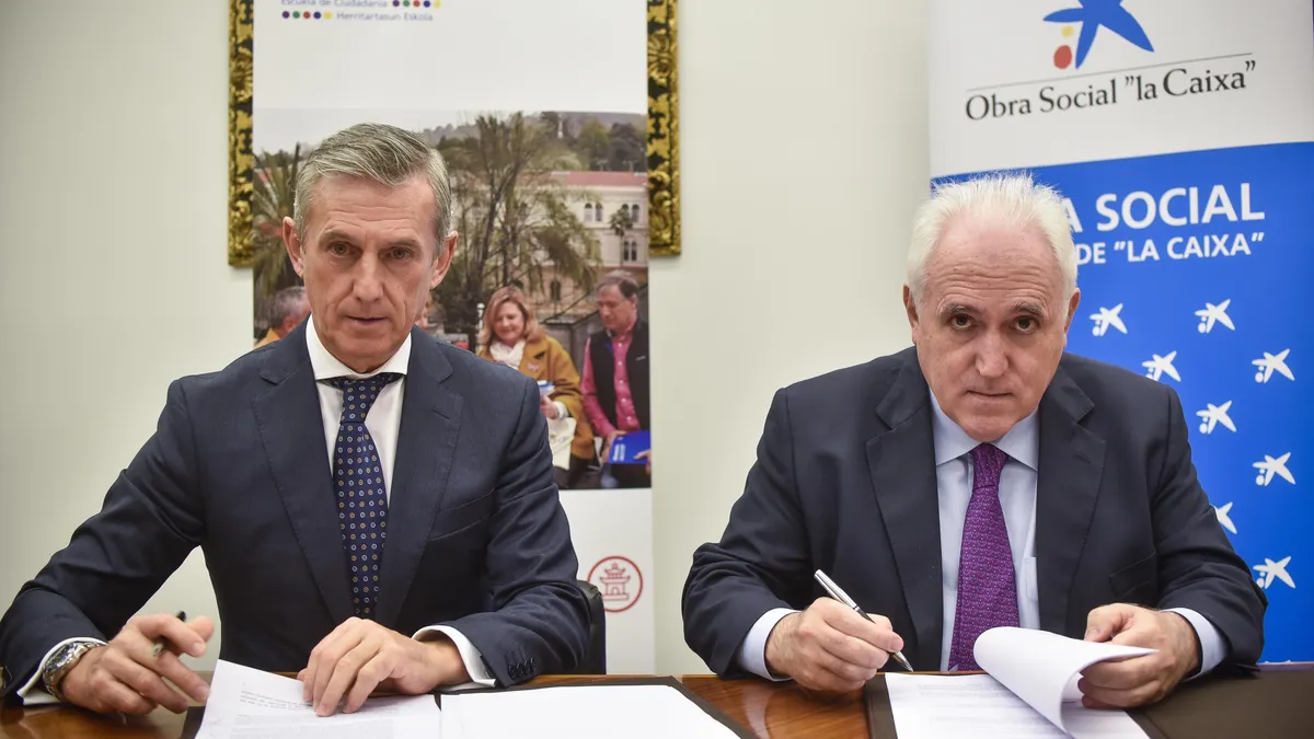 El rector de la Universidad de Deusto, José María Guibert y el director territorial de CaixaBank en el País Vasco y Cantabria, Juan Pedro Badiola, han firmado la renovación del convenio que une a las dos entidades para impulsar el proyecto DeustoBide - Escuela de Ciudadanía.