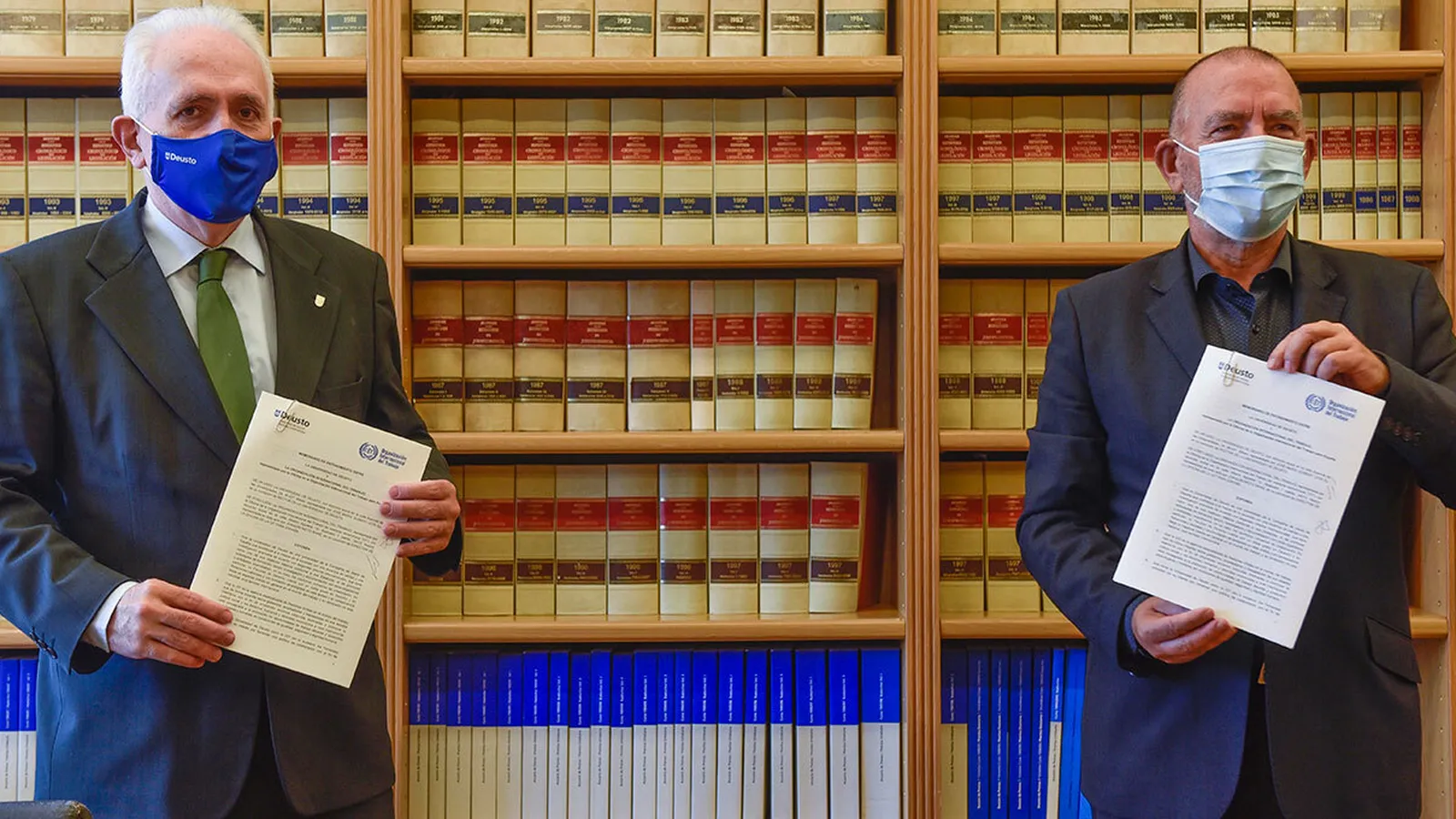 El rector José María Guibert y el responsable de la OIT Joaquín Nieto han sido los encargados de firmar el convenio de colaboración entre Deusto y la Organización Internacional del Trabajo que tiene como fin la colaboración en el desarrollo de proyectos de investigación, de formación de recursos humanos y otras actividades de cooperación técnica en pro de la promoción de los derechos laborales.