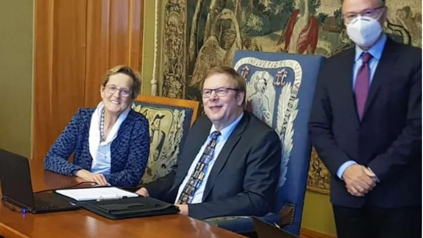 Acompañado por su esposa Karin, el profesor Martin Klöckener fue recibido en la Cámara del Senado por un pequeño comité compuesto por representantes de la Universidad y la Facultad de Teología de Friburgo.