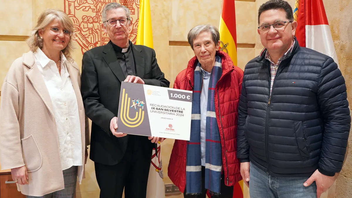 (UPSA).- El Rector de la Universidad Pontificia de Salamanca, Santiago García-Jalón, junto a la vicerrectora de Comunidad Universitaria y Estudiantes, María Hinojal Benavente, ha entregado esta mañana un cheque con la recaudación obtenida a través de la venta de dorsales a los participantes de la IX San Silvestre Universitaria. La recolecta total ha ascendido a un total de 1.000 euros, cantidad que irá destinada íntegramente a Cáritas Diocesana de Valencia para ayudar a los afectados por la DANA.