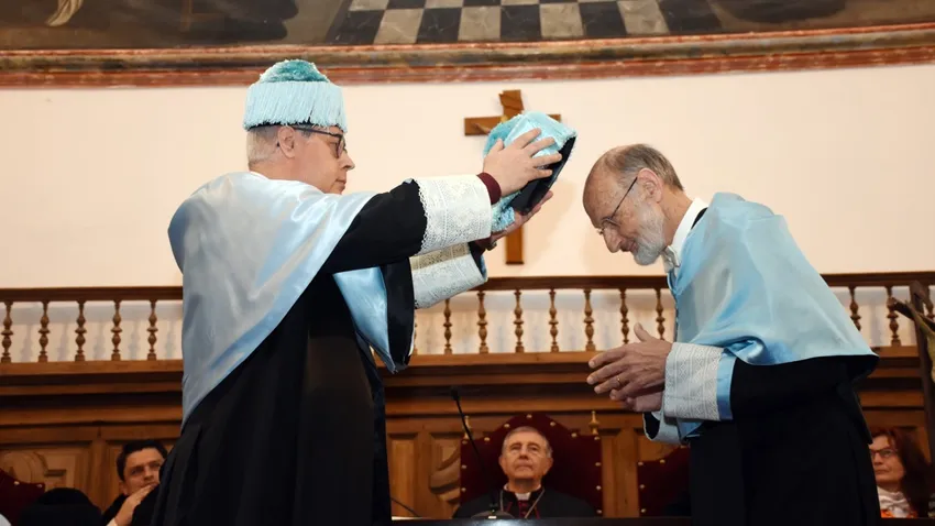Finalmente, el Rector concluyó con su sincera enhorabuena: “El voto de que esta renovada unión entre el Prof. Conill y la Universidad Pontificia de Salamanca siga siendo tan fecunda como hasta ahora ha sido y que se prolongue en el tiempo ad multos annos, ad multos annos”.